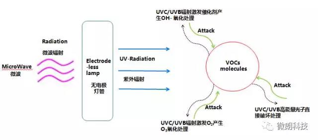 下面本文主要介紹一種新技術(shù)“微波光氧催化技術(shù)”,通過(guò)介紹其原理來(lái)說(shuō)明微波治理VOCs廢氣的奧秘。微波光氧催化技術(shù)對廢氣的處理實(shí)際上是一種復合技術(shù),主要包含以下三個(gè)方面: